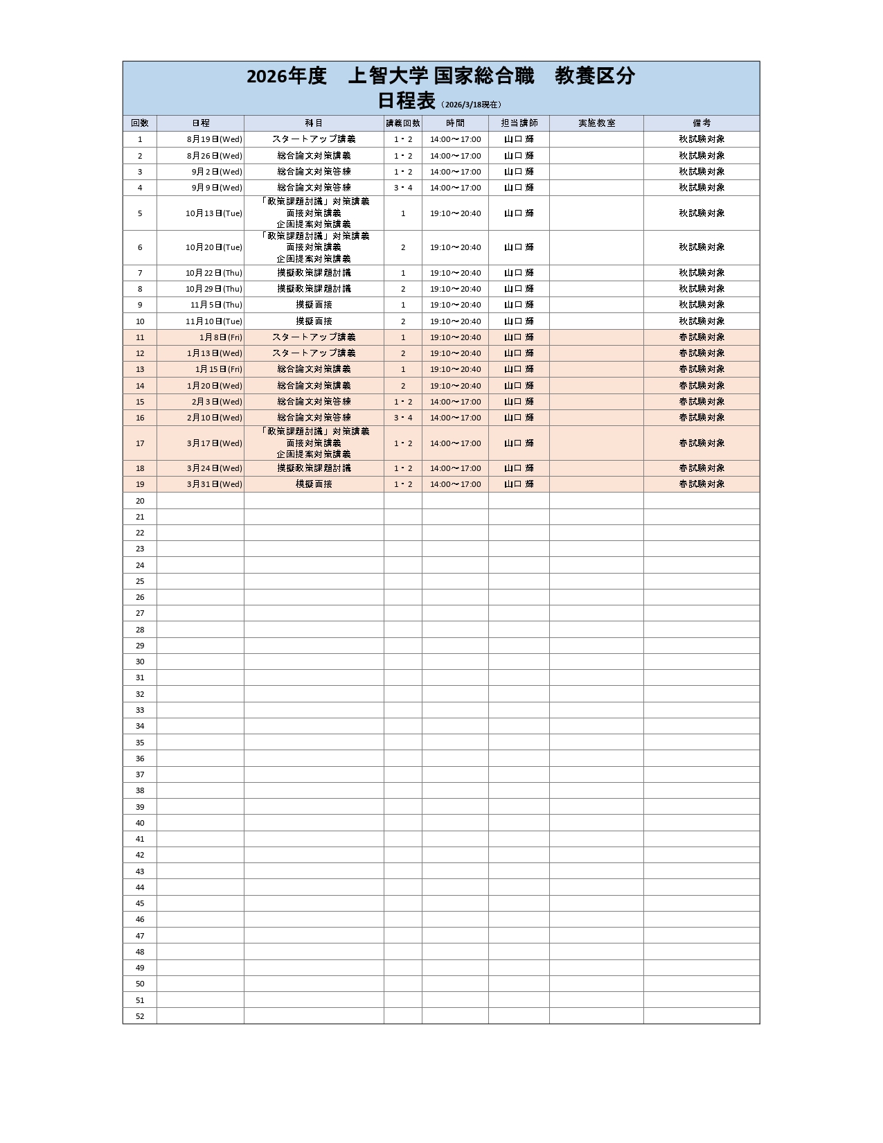 対面講座日程(国家総合職 教養区分)